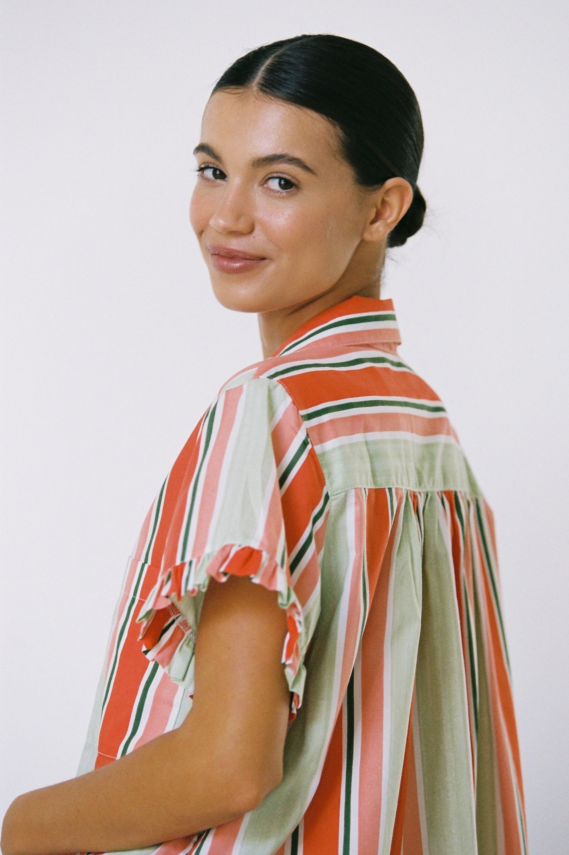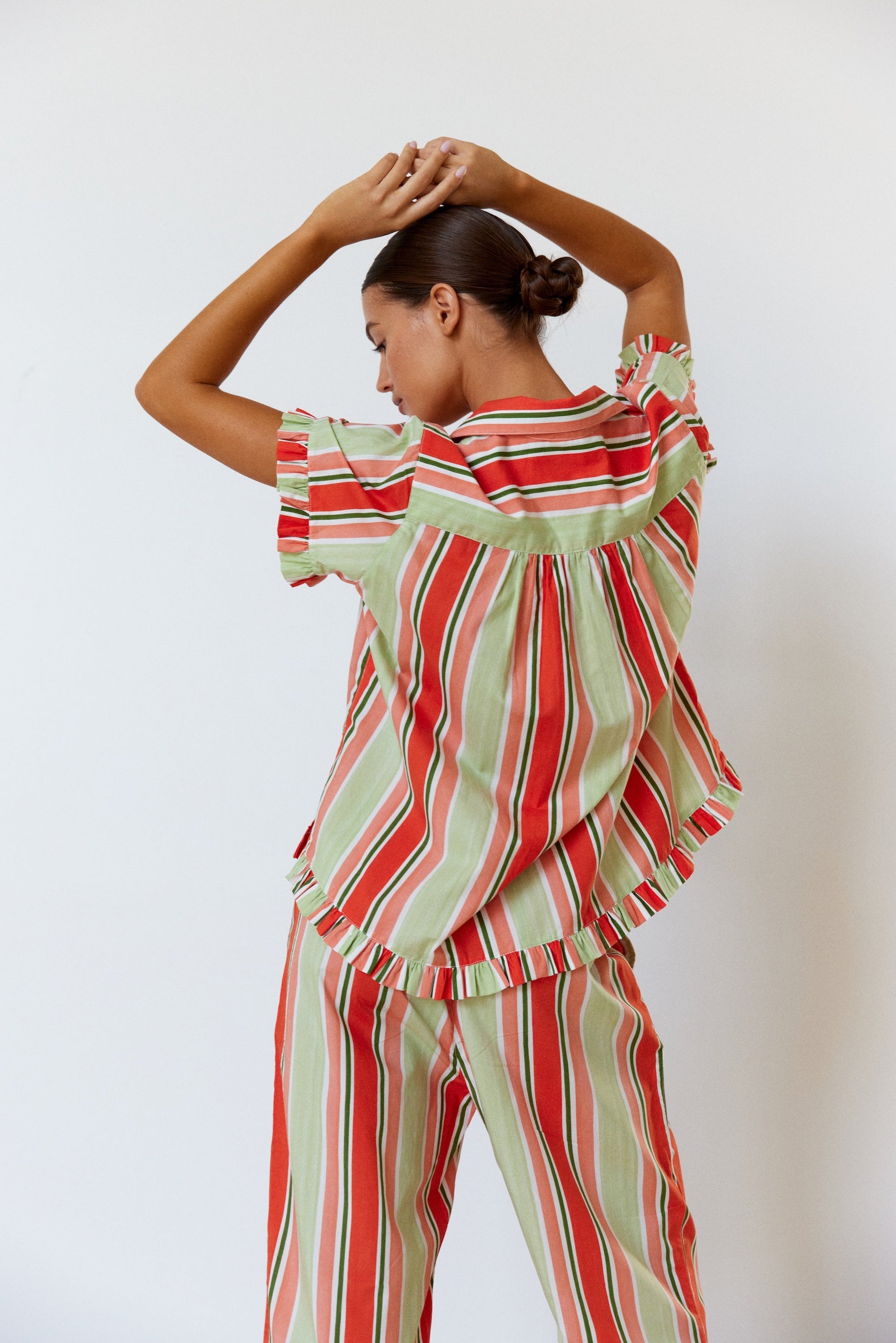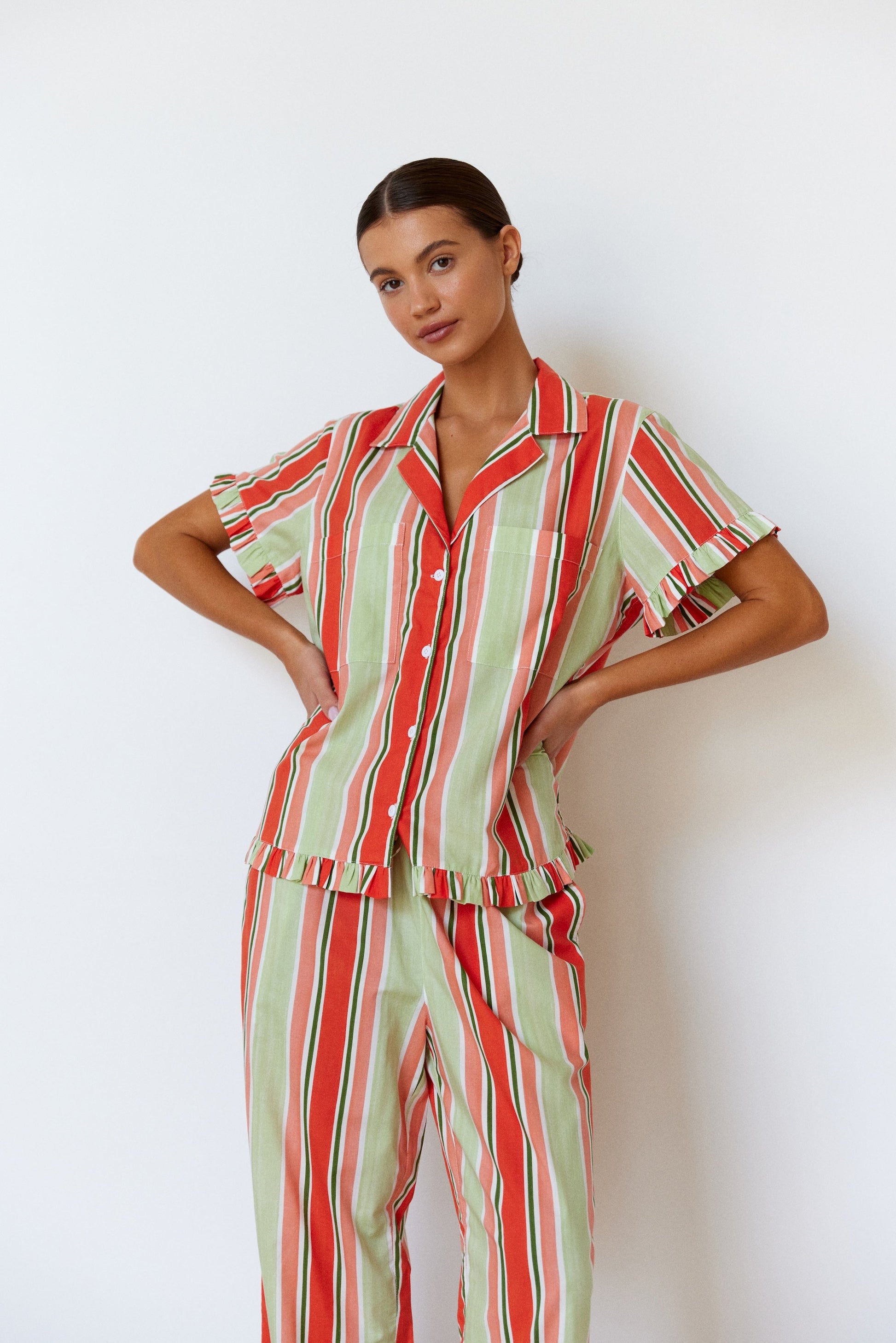 The perfect blend of charm and comfort, the Felicity Frill Pyjama Set is loved for its relaxed fit and soft, femme frills. Limited Edition Holiday Stripe will have you feeling festive and comfortable all summer long.