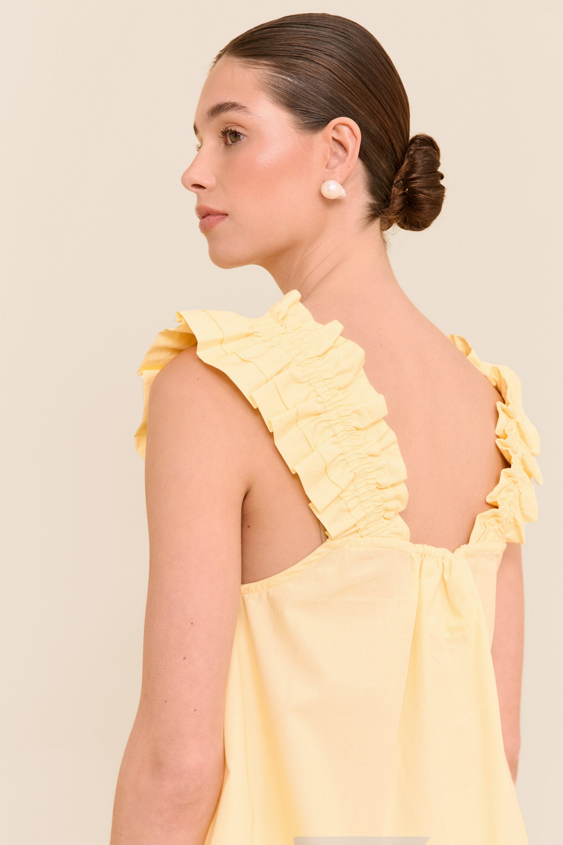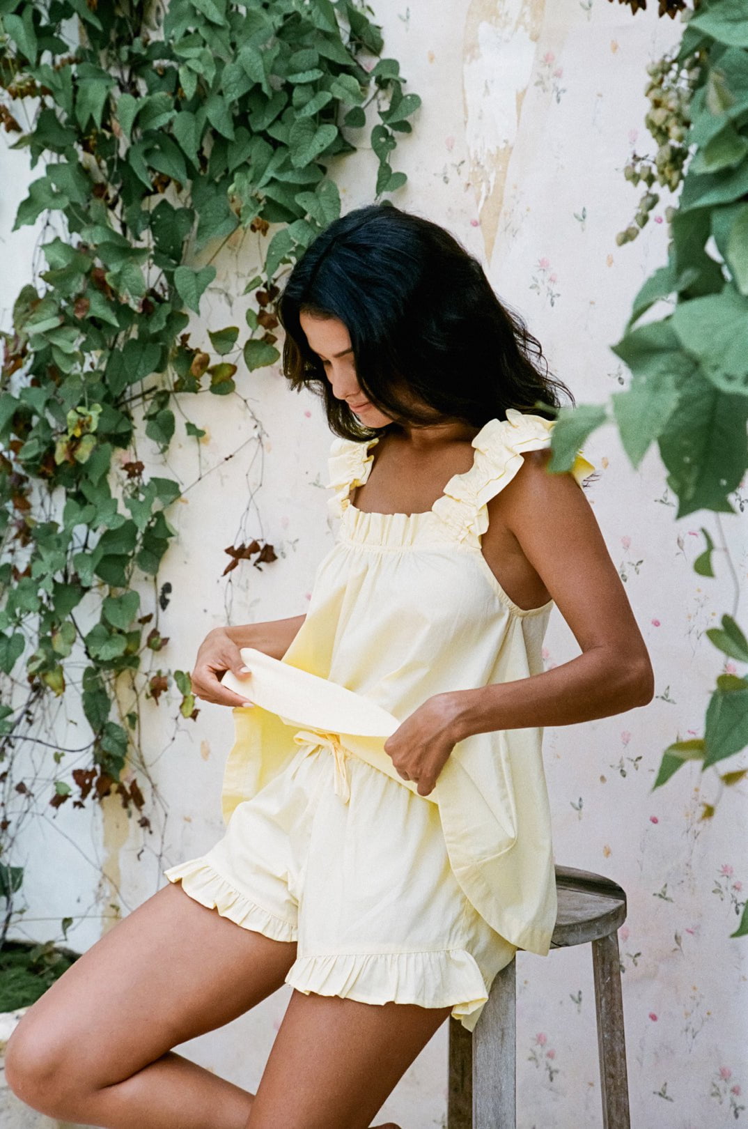 • Elastic drawstring shorts with side ruffles (no pockets)